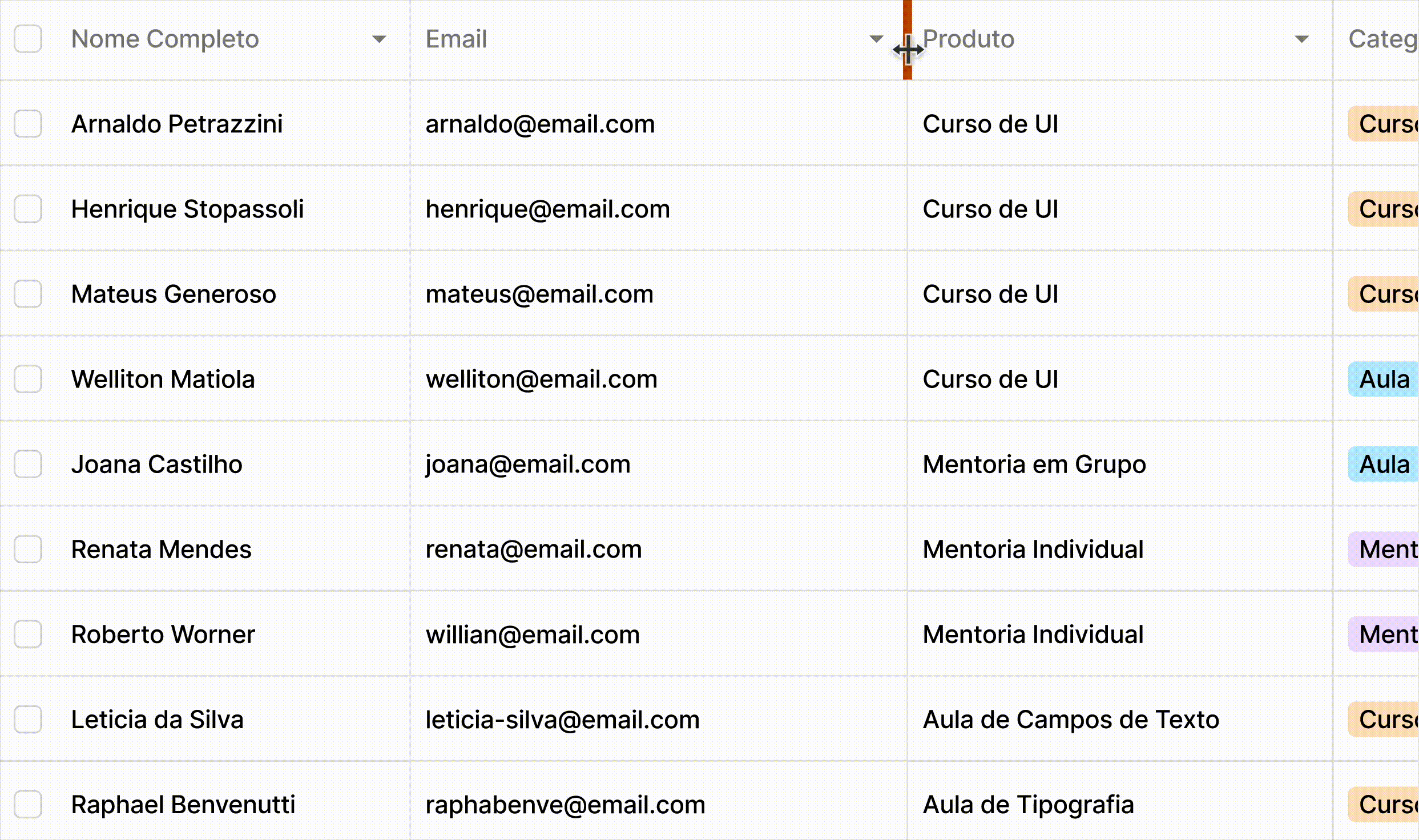 Comum em ferramentas de produtividade, permite que o usuário ajuste a largura para visualizar informações completas.
