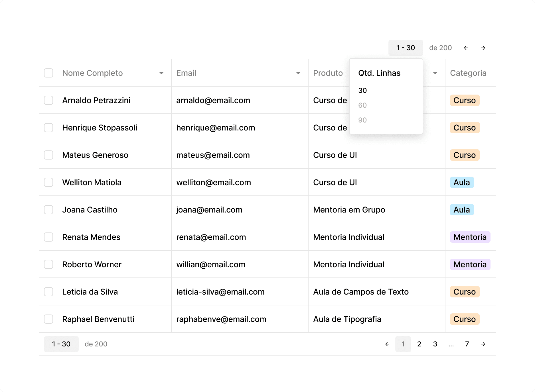 Pode ser posicionada na parte superior ou inferior da tabela, permitindo navegar por grandes datasets.