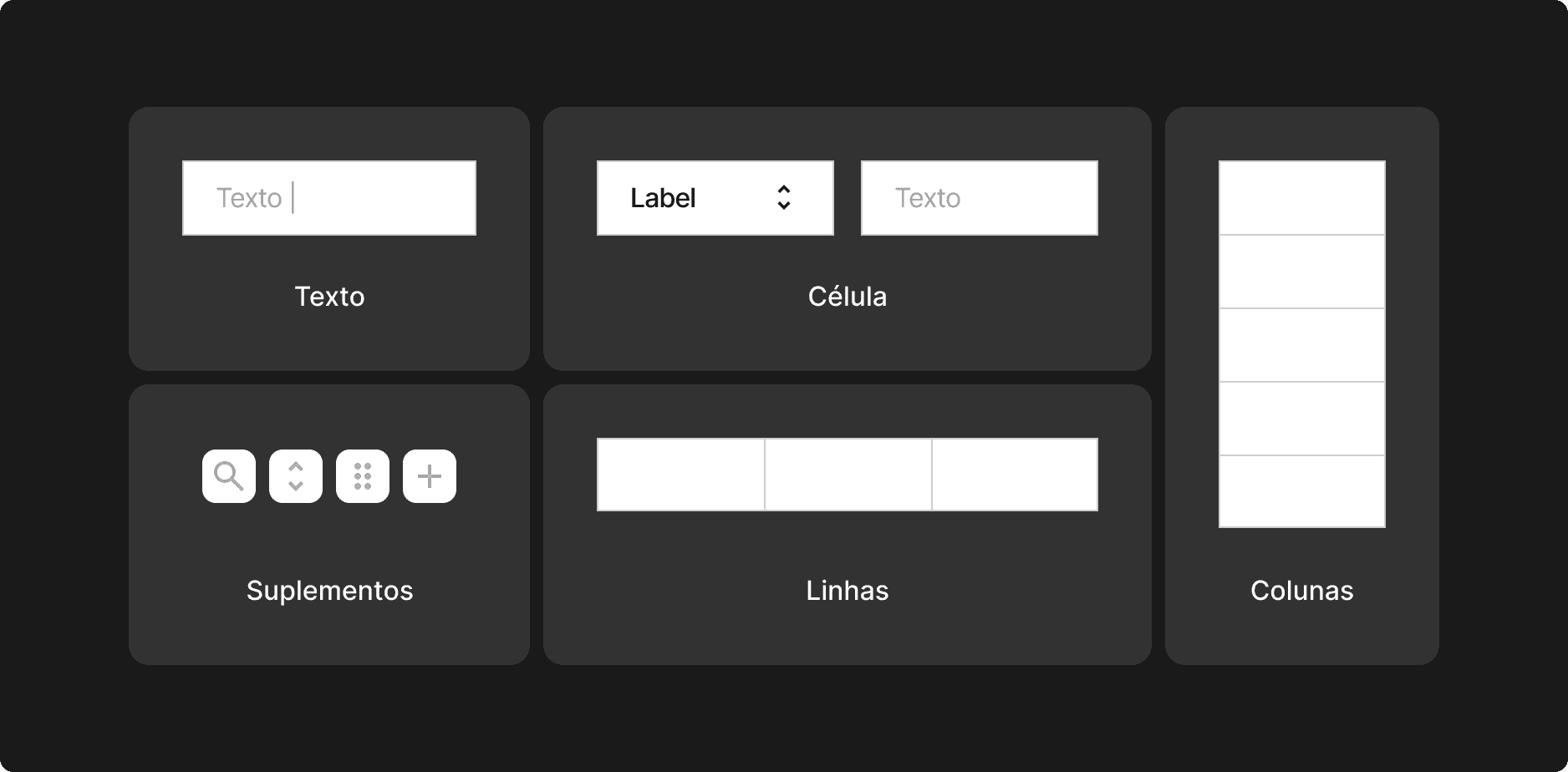 Suplementos: Elementos de interação, como ações dentro das células ou em uma barra superior (topbar).